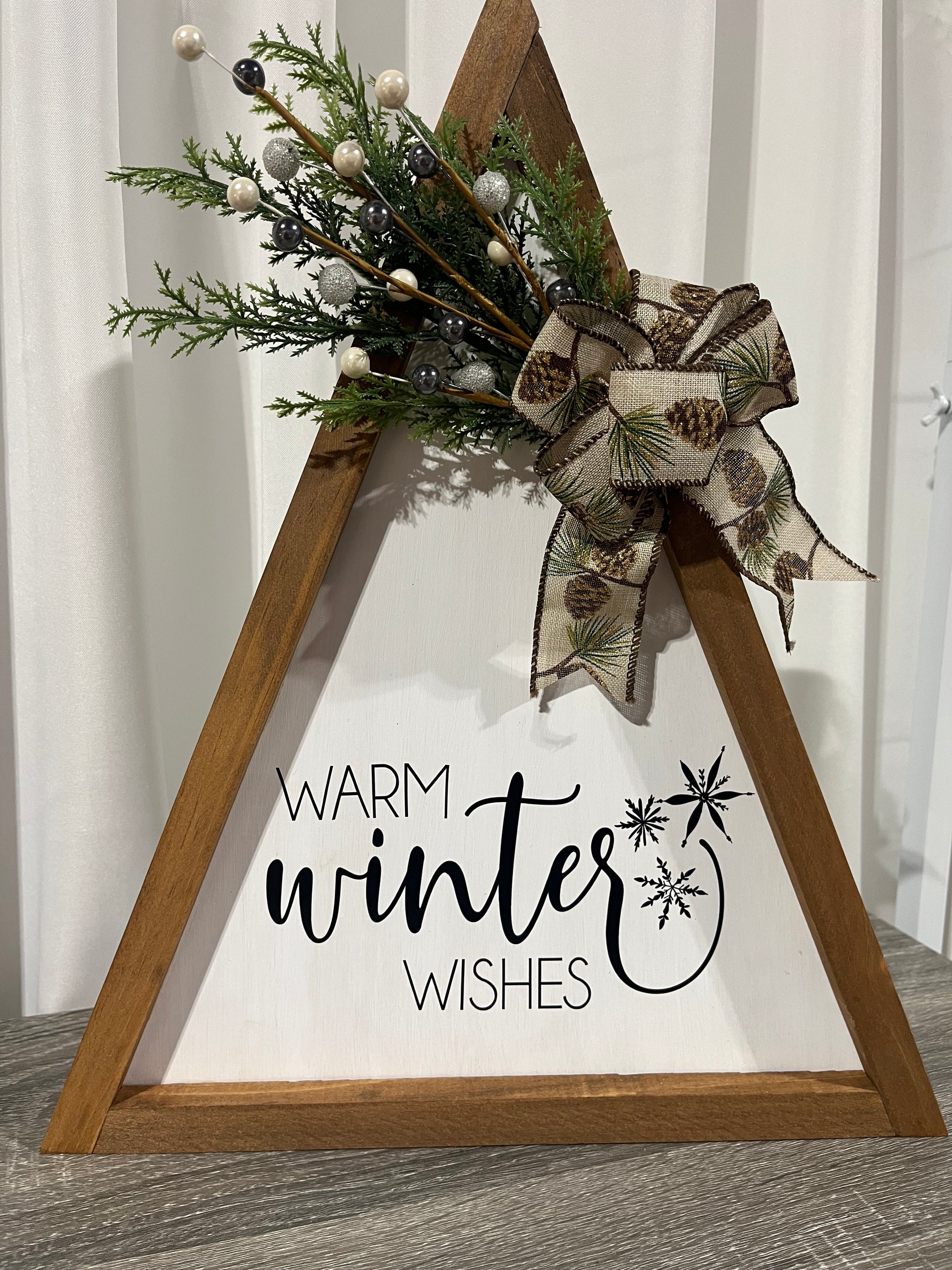 This Lg. Triangle Sign is a handmade, winter-themed wooden sign that adds warmth and charm to any space. Made with care and attention to detail, each sign is unique and adds a touch of rustic elegance to your home or office. Bring the beauty of winter indoors with this charming sign.