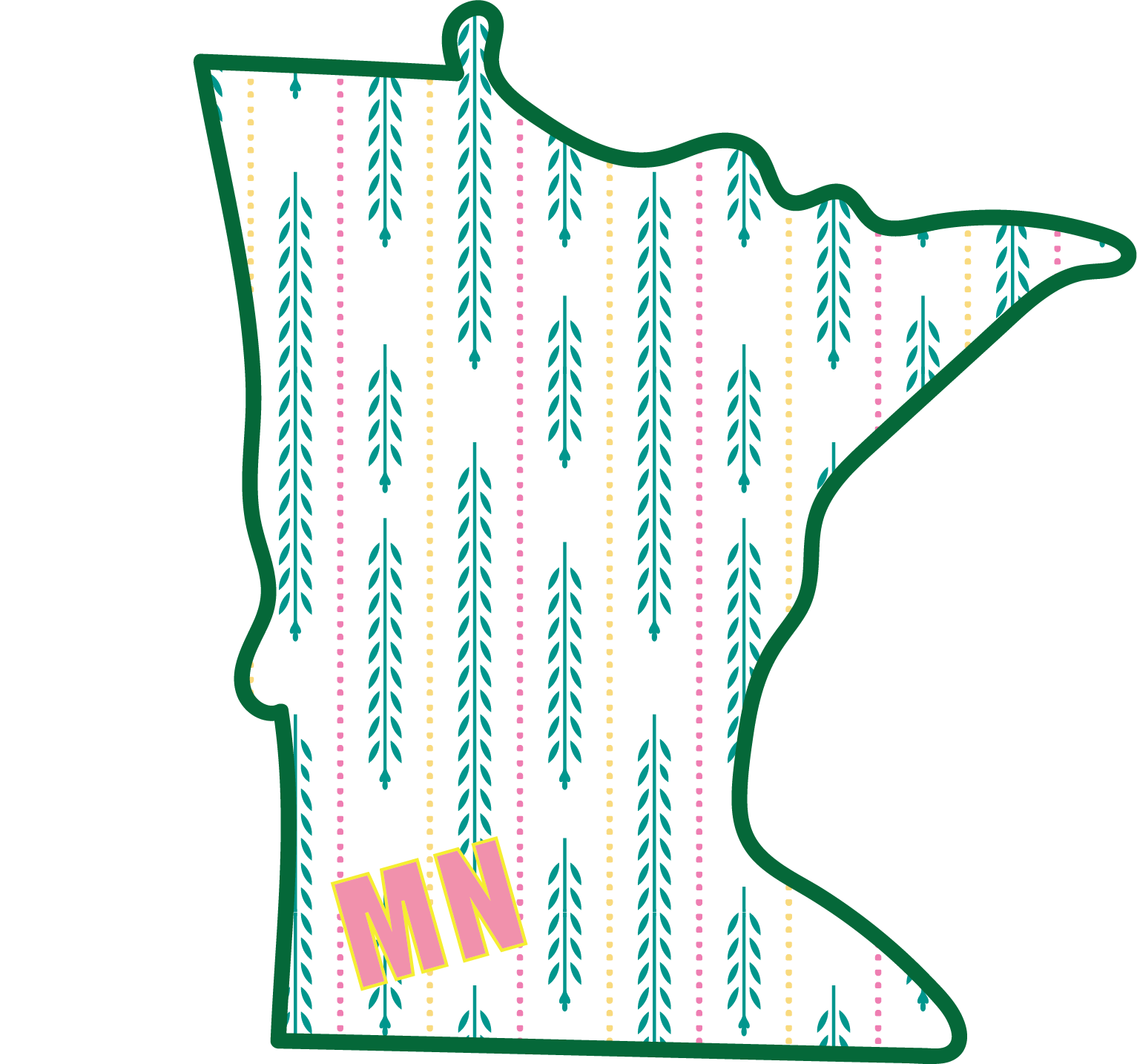 Bring a splash of fun to your Minnesota pride! This edition features teal leaf motifs arranged in vertical stripes, accented with cheerful pink and yellow dotted lines. Finished with a bold “MN” in pink with a golden outline, this design is equal parts modern and whimsical.