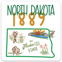 featuring a whimsical souvenir-style illustration of The Flickertail State. Highlighting the state’s founding year (1889) and outline, this colorful, cartoon-inspired design includes iconic ND elements like buffalo, wild horses, prairie wildflowers, windmills, the Sorlie Bridge at sunrise, a moose, and the rugged Badlands landscape.