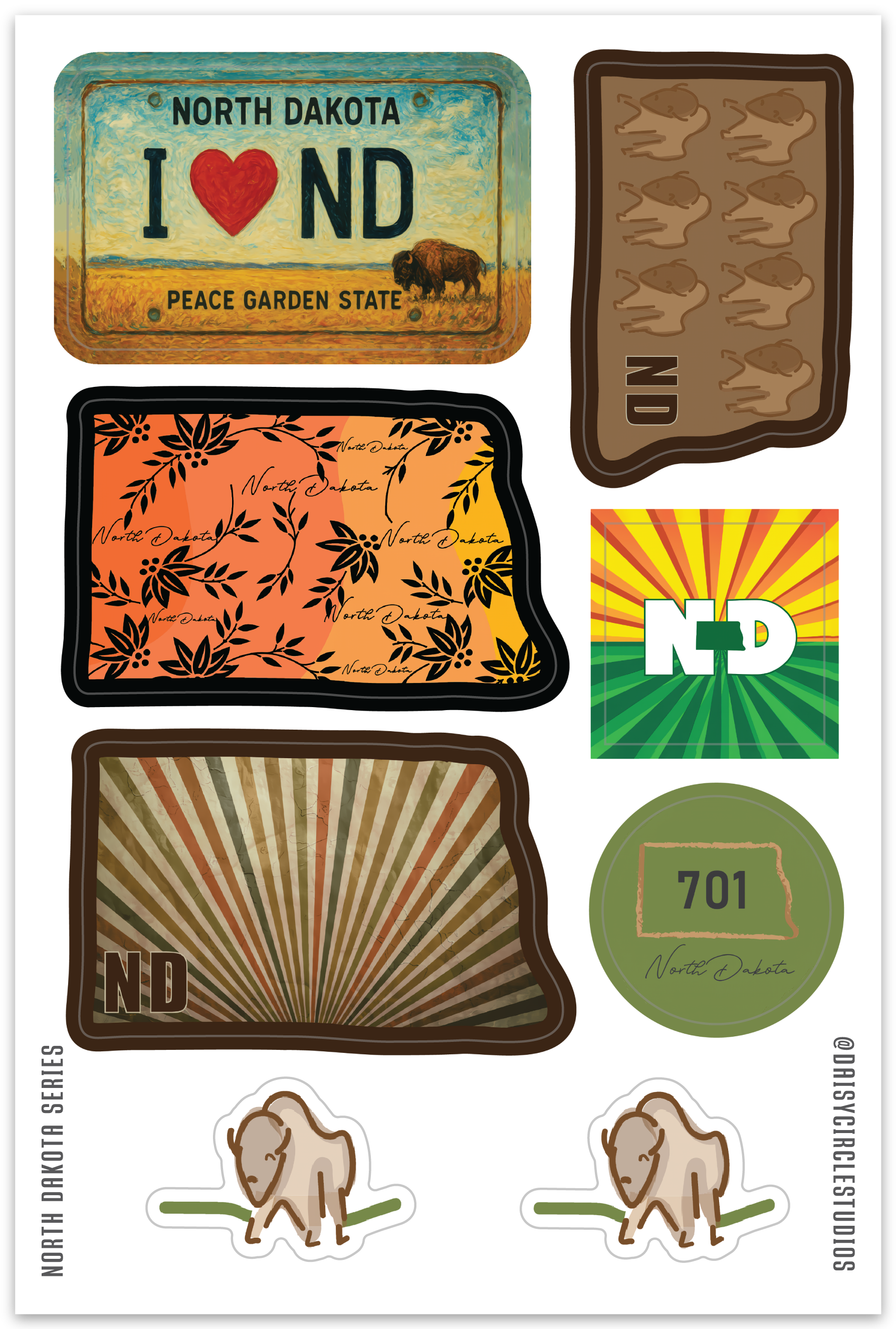 This 6x4 premium vinyl sticker sheet comes with 8 gorgeous ND-themed designs — rustic sunsets, prairie vibes, retro rays, buffalo silhouettes, and our state’s iconic 701.