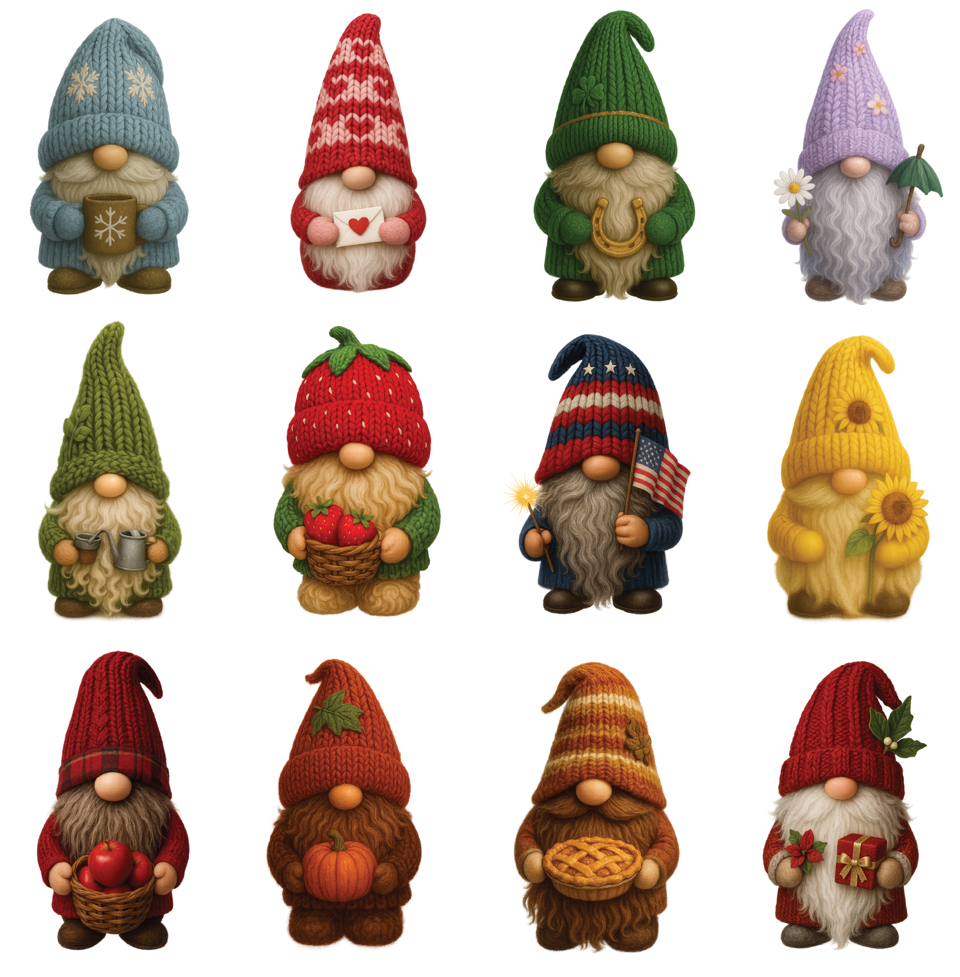 Featuring a full collection of 12 whimsical gnomes dressed for every month of the year (snowflakes, hearts, shamrocks, florals, strawberries, patriotic, sunflowers, apples, pumpkins, pies, and holiday gifts).