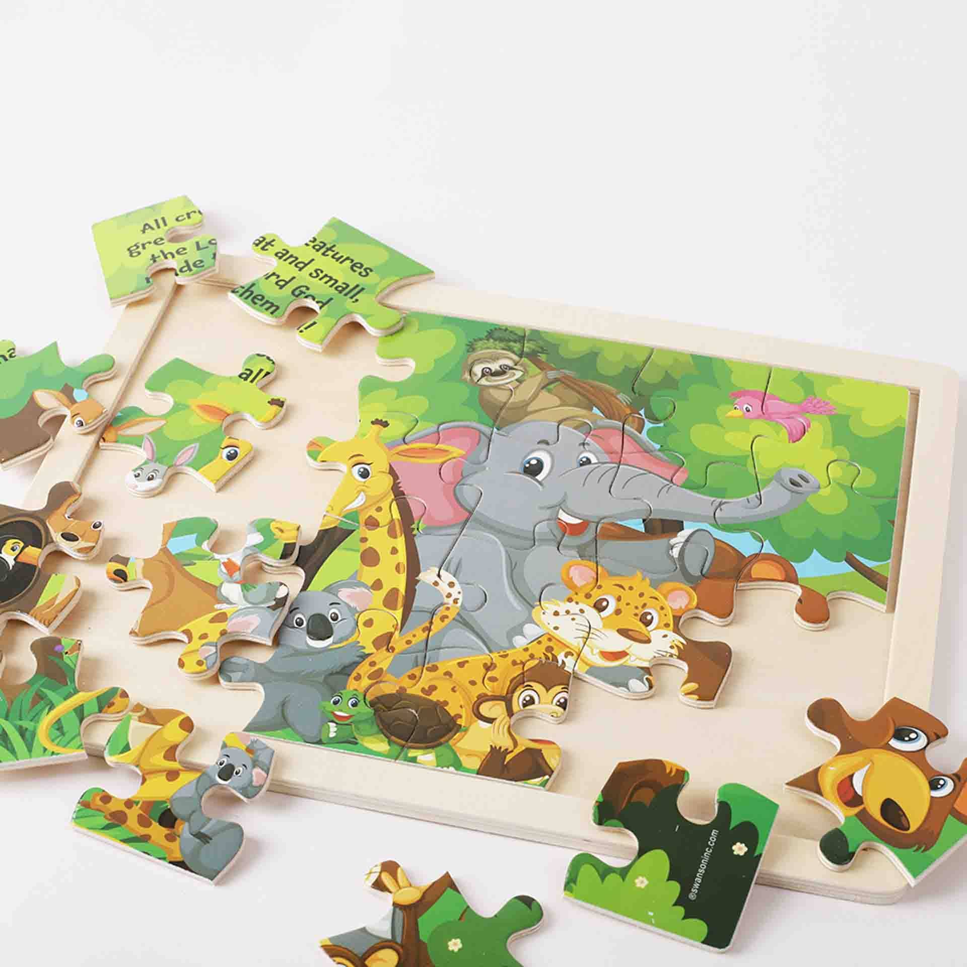 Discover the beauty of God’s creation with our "All Creatures Great and Small" Wooden Puzzle! This engaging educational toy brings little ones face-to-face with creatures big and small as they piece together this meaningful message: "All creatures great and small, the Lord God made them all." Each puzzle piece reveals a part of this colorful world, crafted to capture young imaginations with bright, kid-friendly designs. With smooth edges and a natural wood backing and frame, every detail is made with safety in mind, so it’s perfect for children of all ages. Not only is this puzzle a joy to complete, but it’s also designed to encourage the development of motor skills, spatial awareness, and hand-eye coordination. Sized at 11.875" x 0.325" x 8.75", it’s easy for little hands to grasp and explore, whether at home or on the go.